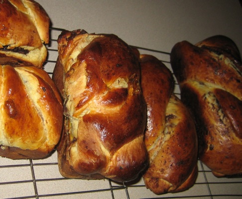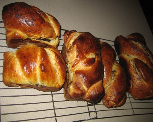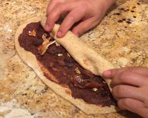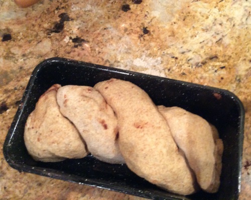 - Repeat process. Take 2 rolls, braid together, and push into loaf pan greased with coconut oil. Repeat process until you have used up all the dough and chocolate spread.
