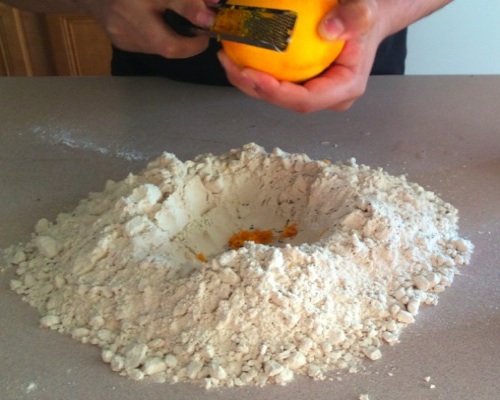 - Grate organic orange rind into flour reservoir with microplane or other grating tool.