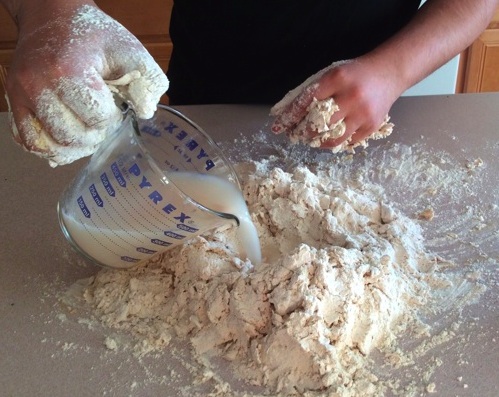 - Pour a 2lb. bag of flour on clean surface for kneading or bread board. Make a reservoir or hole in the middle of your flour volcano (Note: this is the old fashioned way of making the dough. For those of you who are more modern, you may opt to mix in a bowl, or even use a professional stand mixer)