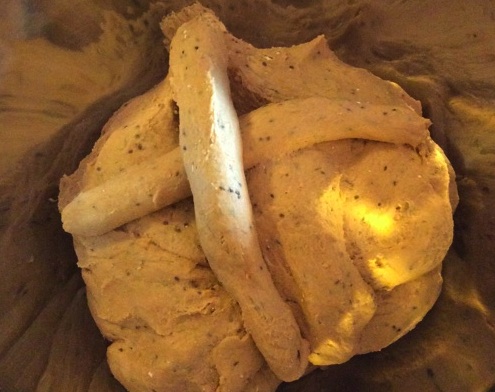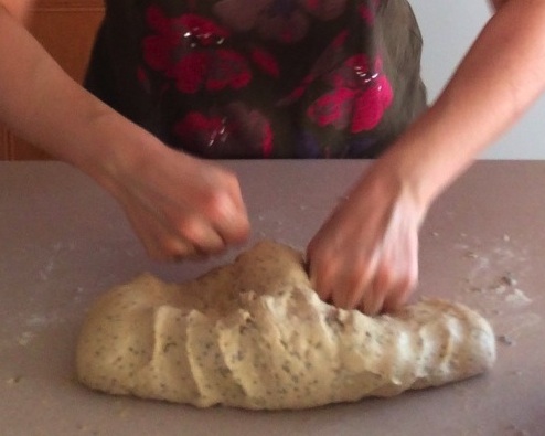 - Become one with the bread dough. Use your intuition, and feel the texture of the dough in your fingers to gauge its moistness and texture. Add a spoonful of extra flour if the dough seems too wet. Add a spoonful of extra chia liquid if dough is too dry. This may take up to 10 minutes or so of kneading, consequent punching down of the dough, and kneading again. You will know the dough is ready once it has a moist elastic texture, but no longer sticks to the table or surface.