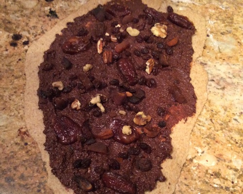 - Spread the delicious chocolate filling onto the flattened dough round. Feel free to add extra fruits and nuts to the top, like a sweet pizza.